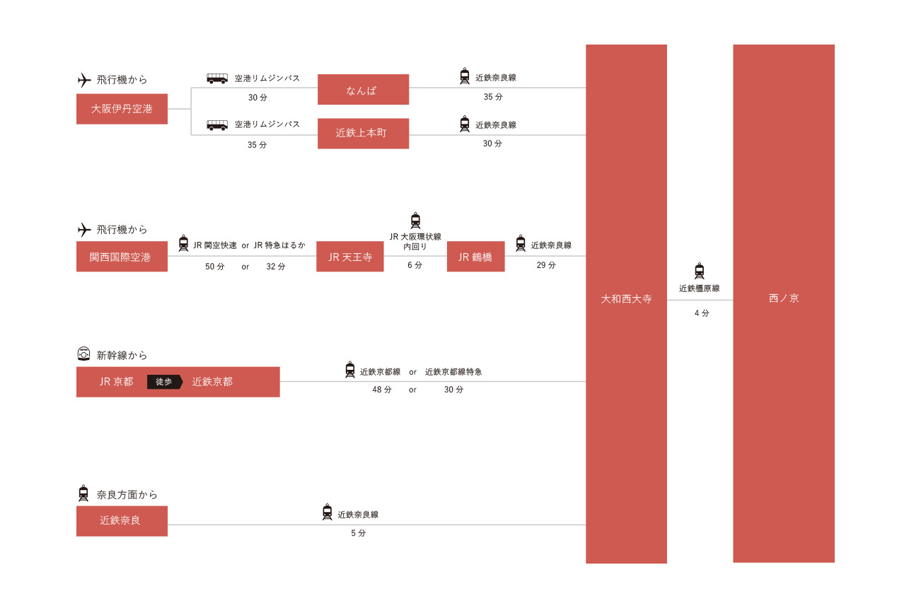 近鉄京都駅・近鉄大阪難波駅から大和西大寺経由 西ノ京駅まで約40分 -