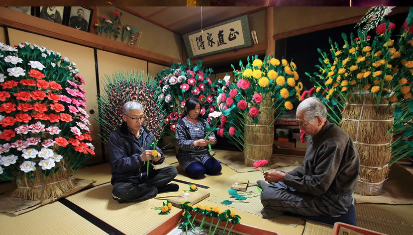 現在、造花は奈良市内の2軒の家で代々作り続けらています。一つひとつ手作りで、紙は薬草などを用いて染め上げられます。