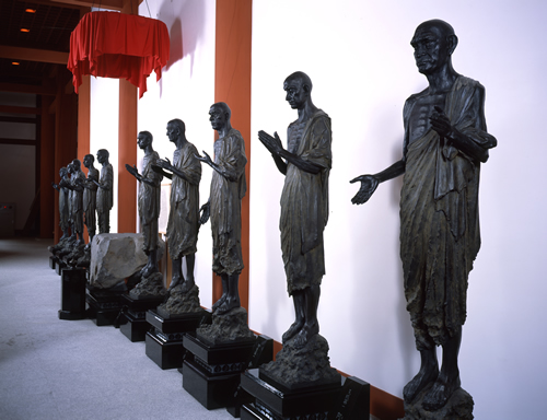 仏足石のお釈迦様に随うように精悍な姿の十大弟子が並んでおられます。文化勲章受章者の中村晋也氏により平成14年(2002)に奉納され、平成15年(2003)大講堂落慶に合わせて安置されました。