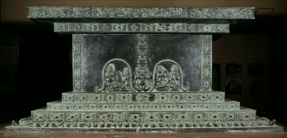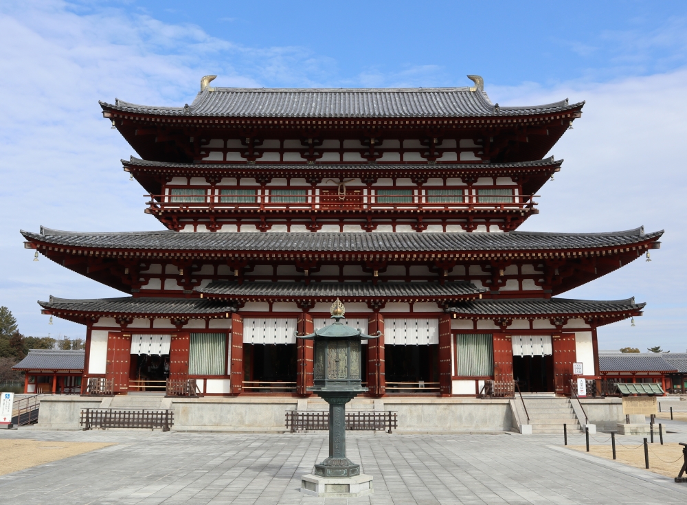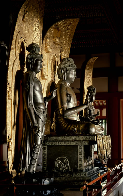 『日本書紀』によると697年7月29日に開眼法要が行われたと考えられ、白鳳時代を代表する金銅仏です。中央に薬師如来、向かって右に日光菩薩、左に