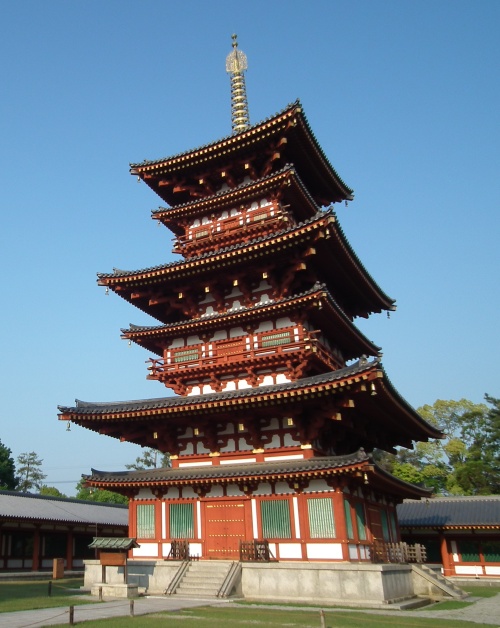薬師寺は、日本で初めて東西に二つの塔を建立した双塔式伽藍として有名です。東塔(国宝)は創建当初から残っていますが、西塔は享禄の兵火(1528)により焼失してしまいました。昭和56年(1981)に再建された西塔は、 長年の風雨にさらされ落ち着いた東塔に対して、創建当初とおなじく鮮やかな青丹の色と金色の飾り金具に彩られて美しいコントラストをみせてくれます。西塔の内陣には、文化勲章受章者の中村晋也氏による釈迦八相像のうち果相の四相が祀られています。