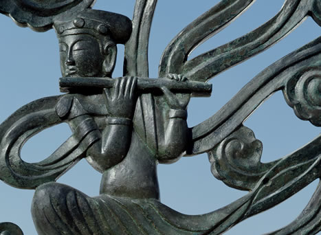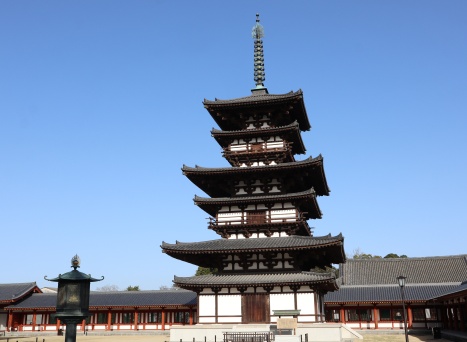 六重に見えますが、実は三重の塔。各層に 裳階 と言われる小さい屋根があり、この大小の屋根の重なりが律動的な美しさをかもし出し「凍れる音楽」という愛称で親しまれています。 平城京に残る最古の建物として、国宝に指定されています。