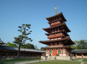 薬師寺のように、中央に本尊を祀る金堂と、東西に二基の塔を配する伽藍配置は、薬師寺が日本で最初です。