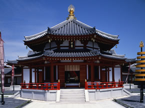 薬師寺の宗派、法相宗の鼻祖である玄奘三蔵の頂骨を奉安し、玄奘三蔵の遺徳を顕彰する伽藍です。平山郁夫画伯の手による大唐西域壁画が奉納されています。平成3年(1991)建立