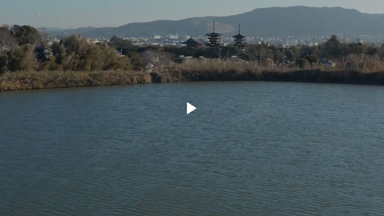 昭和43年から続けられている、お写経勧進による薬師寺伽藍復興は50年を超え、この間に金堂・西塔・大講堂など多くのお堂が再建されました。勝間田池からの遠望に加え、復興された薬師寺式伽藍を空からご覧ください。