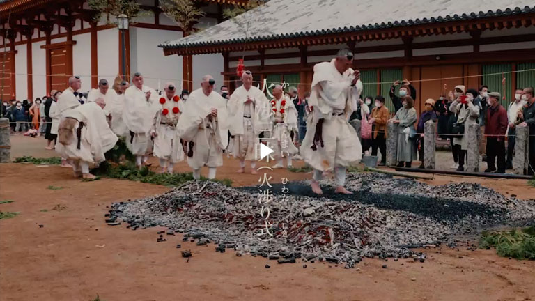 薬師寺に古くから伝わる南都修験道では、3月25日・10月8日の年2回柴燈大護摩・火渉三昧(火渉り式)を厳修致します。修験者は、皆様から寄せられた護摩木を祈願し炉中へ献じ、家内安全や健康などを願います。