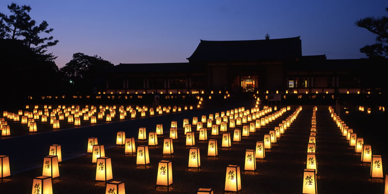 玄奘三蔵会大祭は、薬師寺の宗派である法相宗の教えをインドから中国に伝えられた玄奘三蔵(三蔵法師)の遺徳を偲ぶ法要です。5月5日には奈良時代の芸能である伎楽が奉納され、夜には境内に並べられた約三千基の灯篭に火が灯される万灯会も行われます。